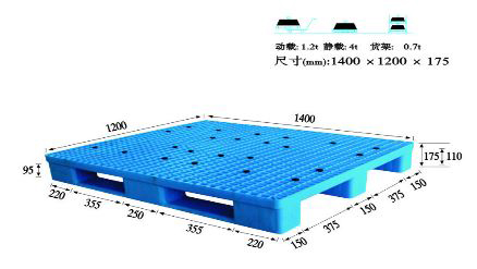 單面塑料托盤(pán)只能一面使用,表面有網(wǎng)格狀和平板狀兩種,底部有川字型、田字型、九腳型。